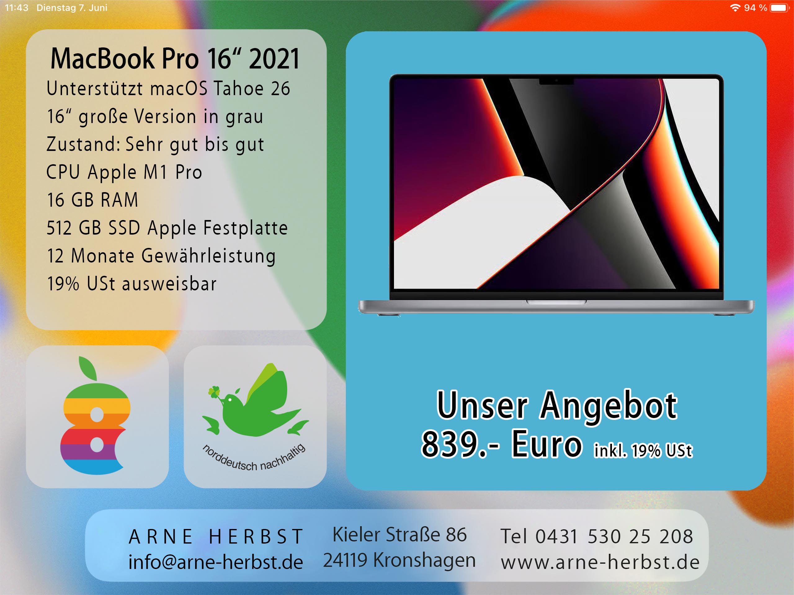 MacBook Pro 16″ aus 2021 M1 Pro für 839.- Euro